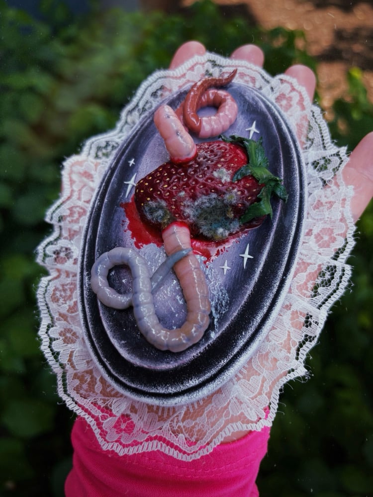 “Fruit of Decay” is a handcrafted, one of a kind wall piece measuring 6.5 inches long & 4.5 inches wide. It features a hand sculpted strawberry starting to rot & mold, & a hand detailed worm passing through it. The background has a dark black & white finish.