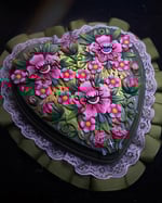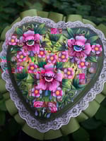The piece is framed with pink lace & mossy olive green ribbon.