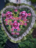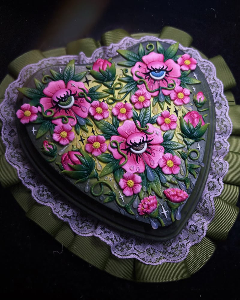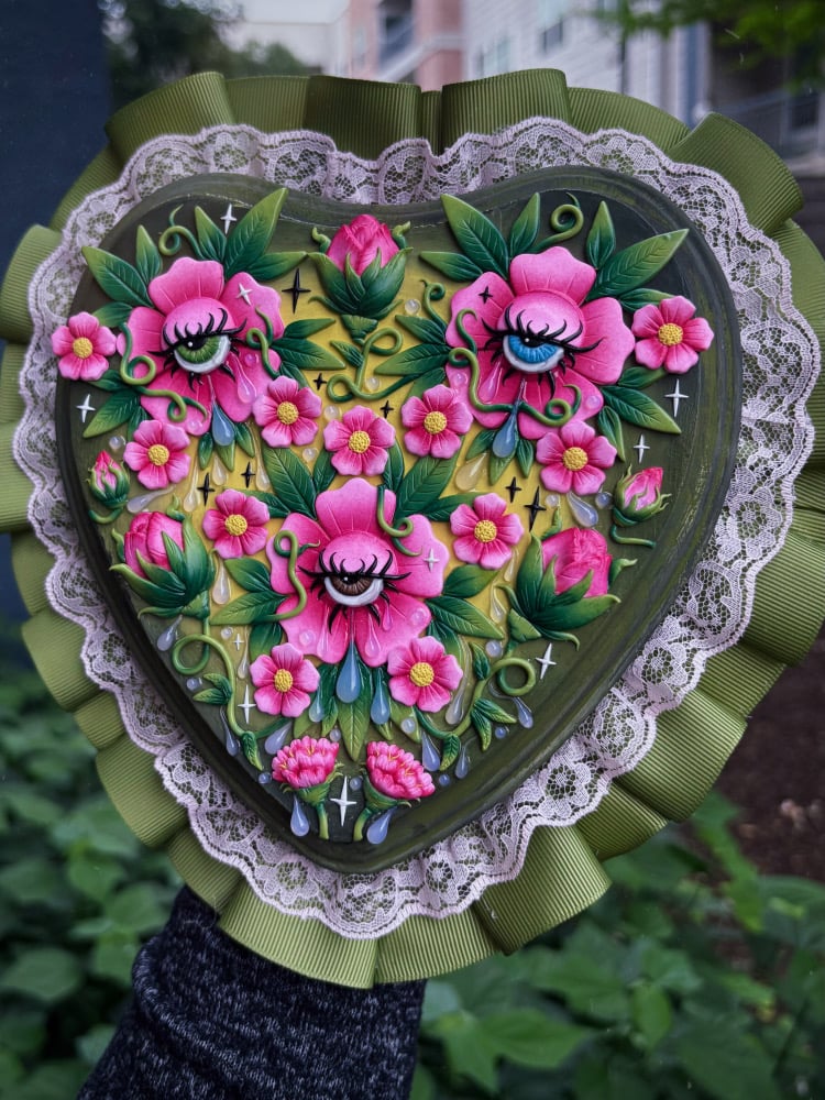 “Garden of Almost” is a handcrafted, one of a kind wall piece measuring rpughly 8.5 inches long & 8.5 inches wide. It features 3 polymer clay flowers with crying eyes, vines, leaves, flower buds, tears.